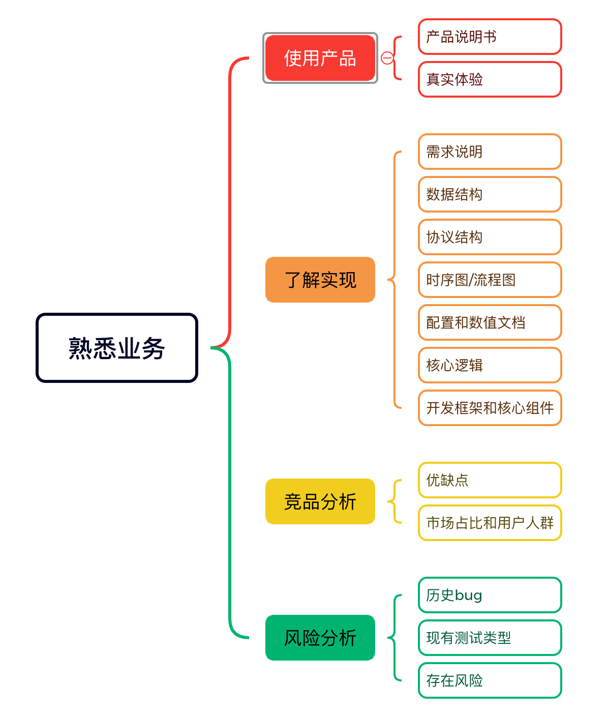 我个人会从以下几个方面去熟悉新业务,见下图: